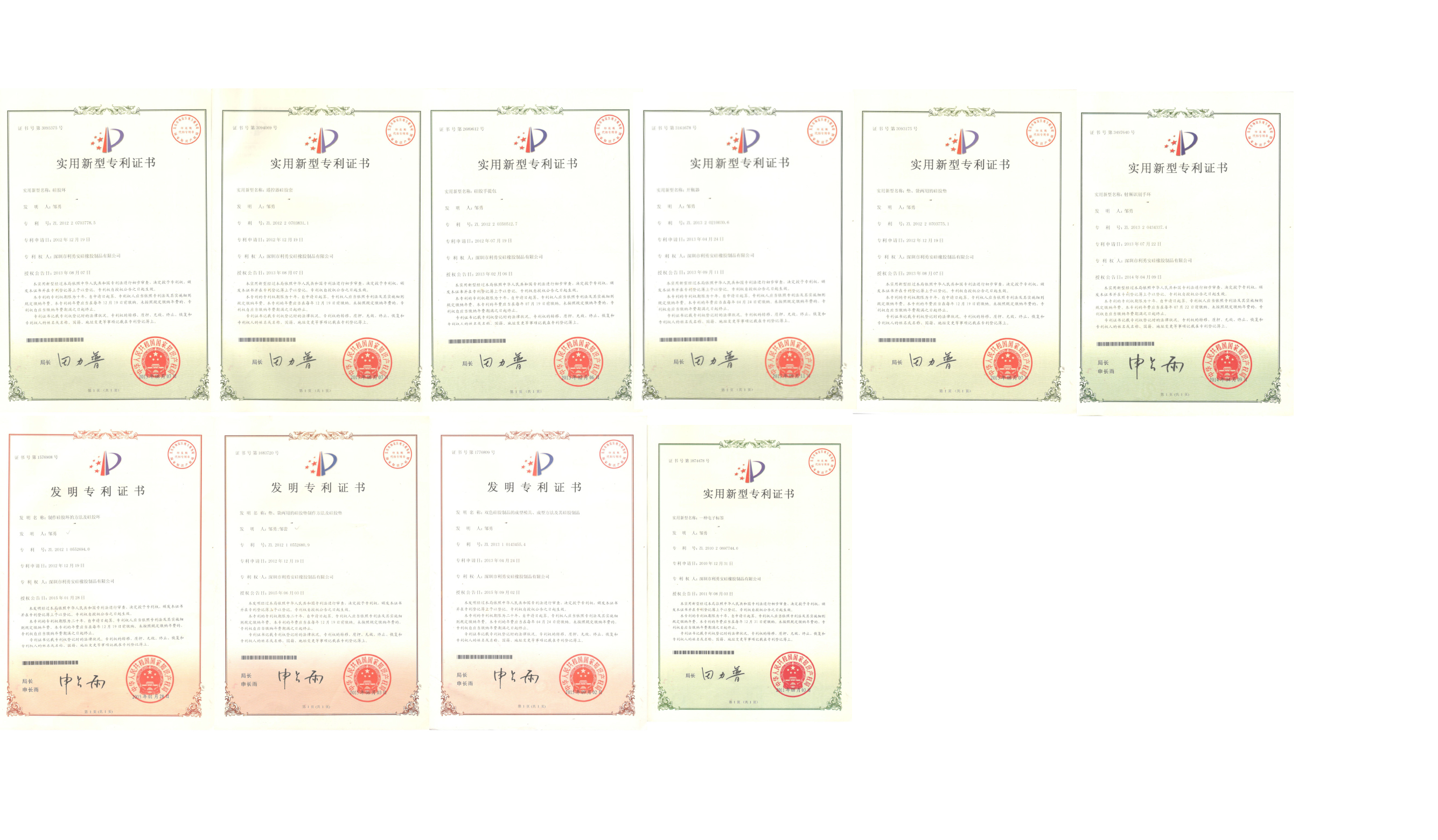 首次取得硅膠制品實用新型專利2個